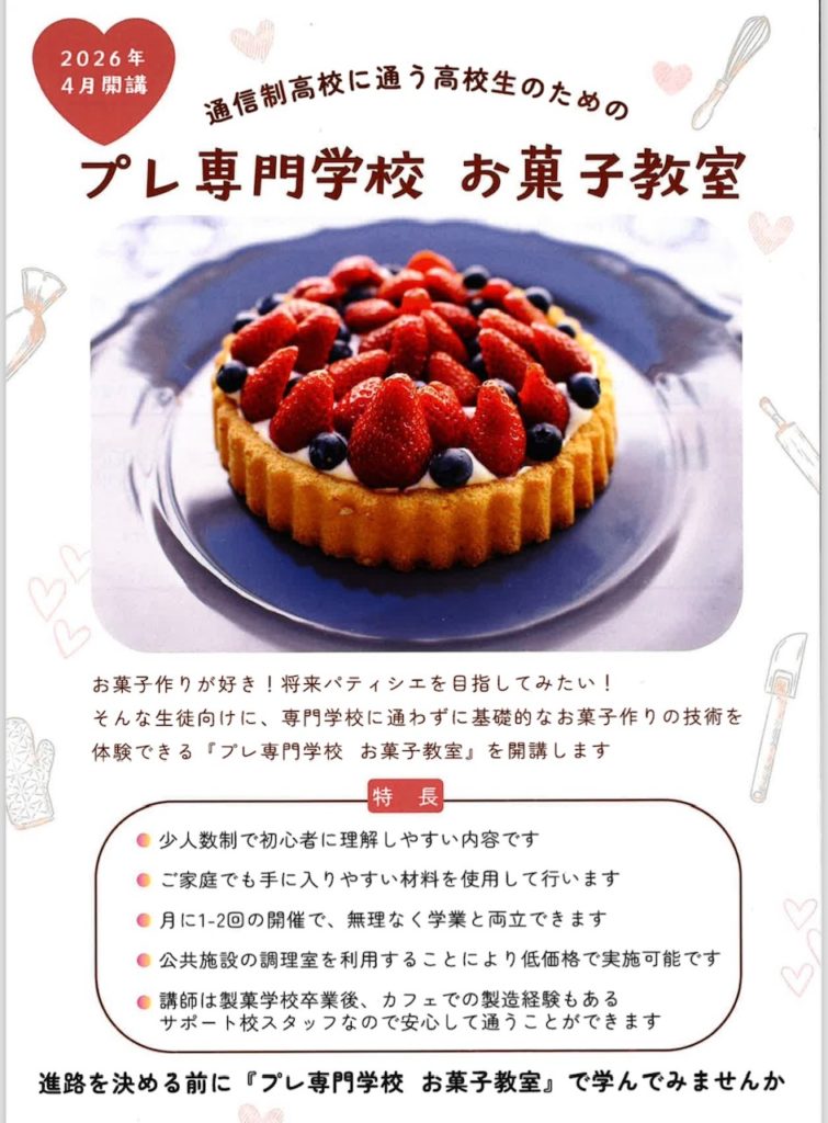 お菓子作りは好きだけど専門学校は続くかな。。。と考えている人に、通信制高校に通いながら体験できる、「プレ専門学校」。
